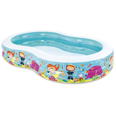 Надувной бассейн Райская лагуна с разноцветными внешними стенками и водоотводом в полу. Бассейн сделан из прочного винила, имеет 2 воздушные камеры с двойными клапанами. В нем могут купаться несколько детей и взрослых одновременно. В набор входит ремкомплект.