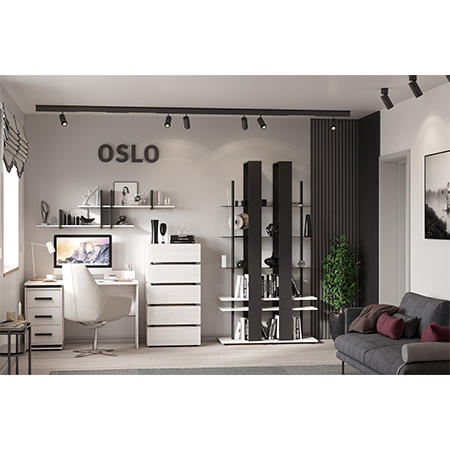 Лаконичные гладкие фасады ящиков в декоре Бетон Пайн светлый в комбинации с контрастными черными планками делают комод поистине уникальным.