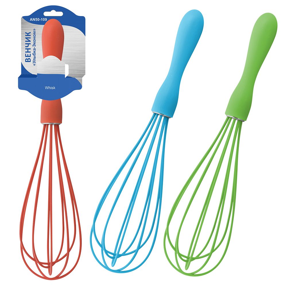 Изготовлено: рабочая часть из нержавеющей металлической проволоки с силиконовым покрытием, ручка из пластмассы (полипропилен)