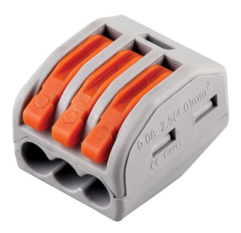 Соединительные клеммы Wago захватывают зачищенные тонкопроволочные проводники без инструментов. Благодаря утопленному рычажку у клеммы, исключено случайное неправильное нажатие на него при вкладывании в тесное пространство для встраивания